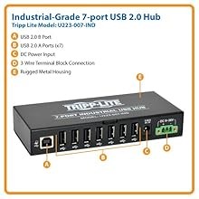 Heavy Duty Industrial-Grade 7-Port USB HubTripp Lite''s U223-007-IND 7-port USB 2.0 Industrial-Grade Hub allows you to attach multiple USB devices to a single USB port on your computer and provides USB 2.0 hi-speed data transmission up to 480 Mbps. Electrostatic discharge (ESD) protection to ±15 kV reduces potential static damage while overcurrent protection guards against power surges and voltage spikes, saving your connected peripherals from damage and data loss. With its robust protection features and industrial-grade metal enclosure design, the U223-007-IND is ideal for use in factories and other demanding electrical environments. Typical Applications: - Rugged 7-port USB 2.0 hub for use in data centers, work areas, and industrial applications. - Add additional, easy to access USB ports to rack mounted equipment. - Install a USB hub that can be securely mounted to a surface or inside an equipment rack DIN rail. |