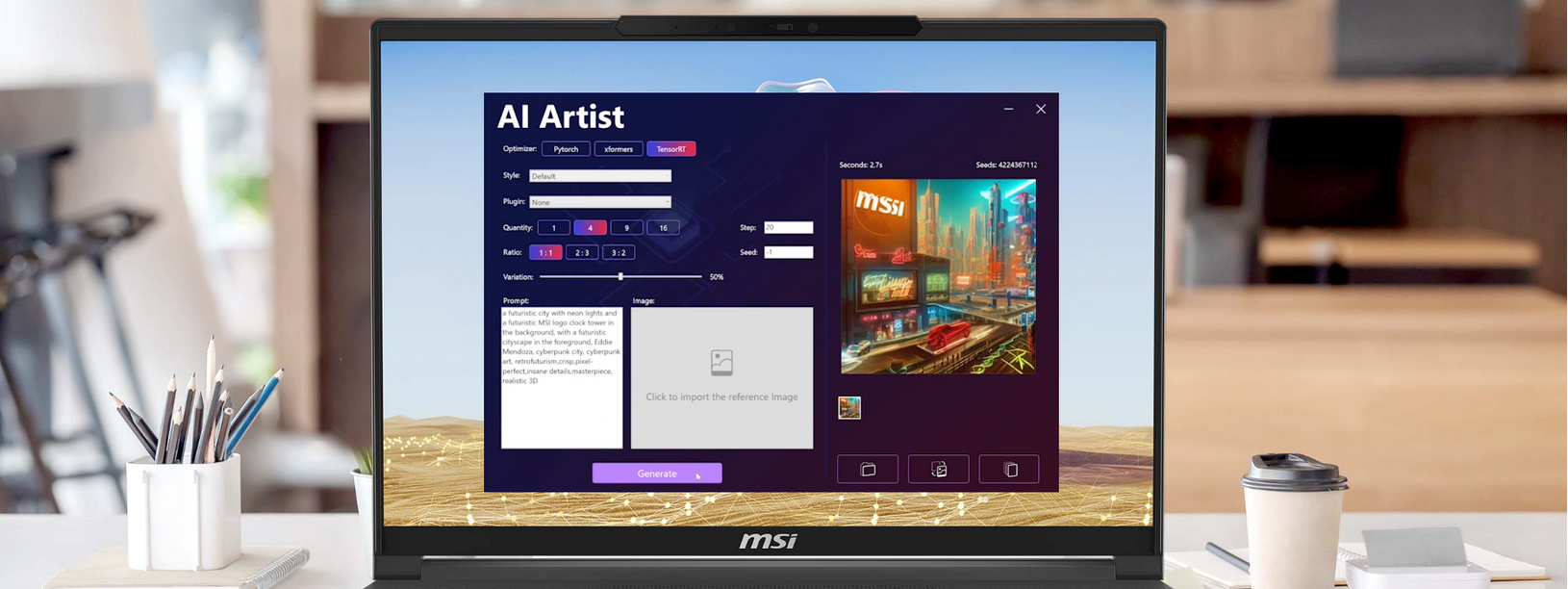 Generate images directly on your laptop with MSI AI Artist. You can create rich images with shorter prompts and generate words within images. MSI AI Artist offers stunning image composition that results in realistic and amazing visuals. Create and inspire at a whole new level.