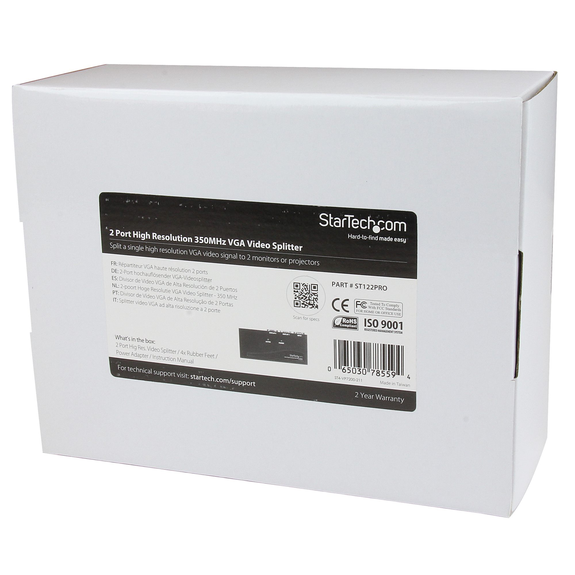 The ST122PRO 2 Port High Resolution VGA Video Splitter - 350 MHz splits a VGA video source signal to 2 monitors or projectors simultaneously - a professional grade solution that is perfect for presentations, classrooms, tradeshows, or in-store displays, where the highest quality video on several monitors is needed.