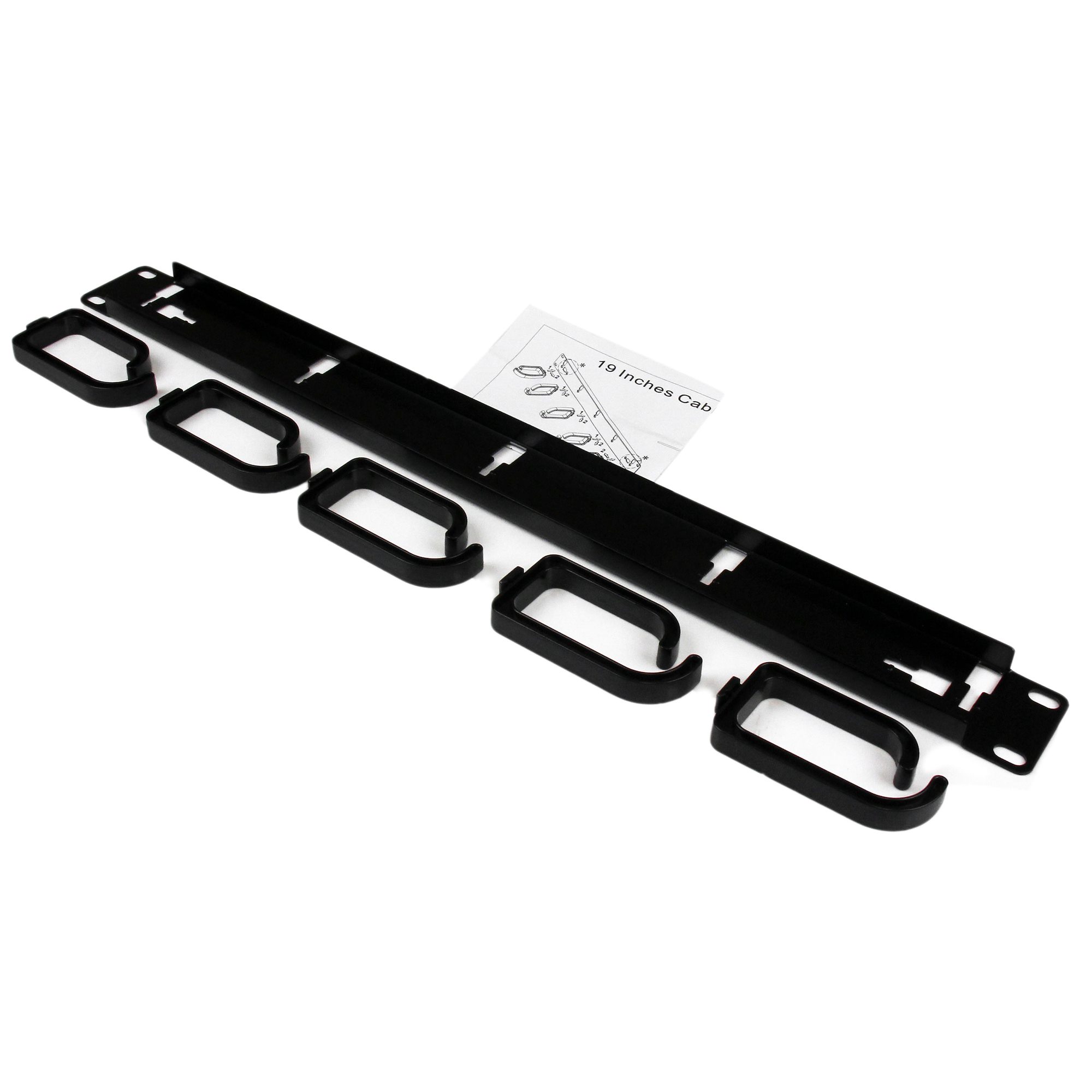 Constructed of high-quality steel, the cable organizer panel offers 5 removable ABS plastic D-Ring hooks, spaced 4in (105mm) apart for routing cables through your server rack and reducing cable strain. As an added benefit, the hook on either end of the panel can be turned 90° to accommodate horizontal or vertical rack cabling as needed.