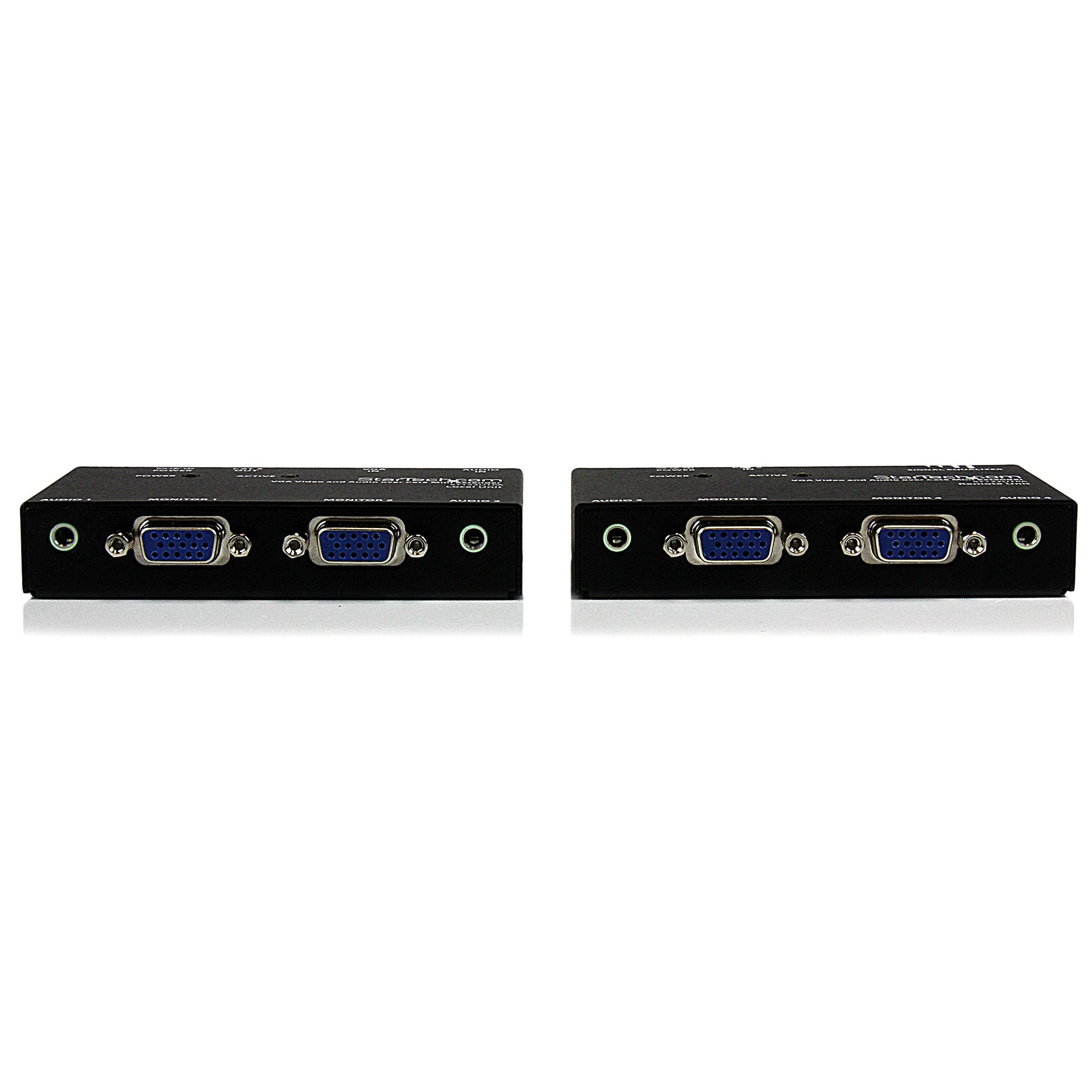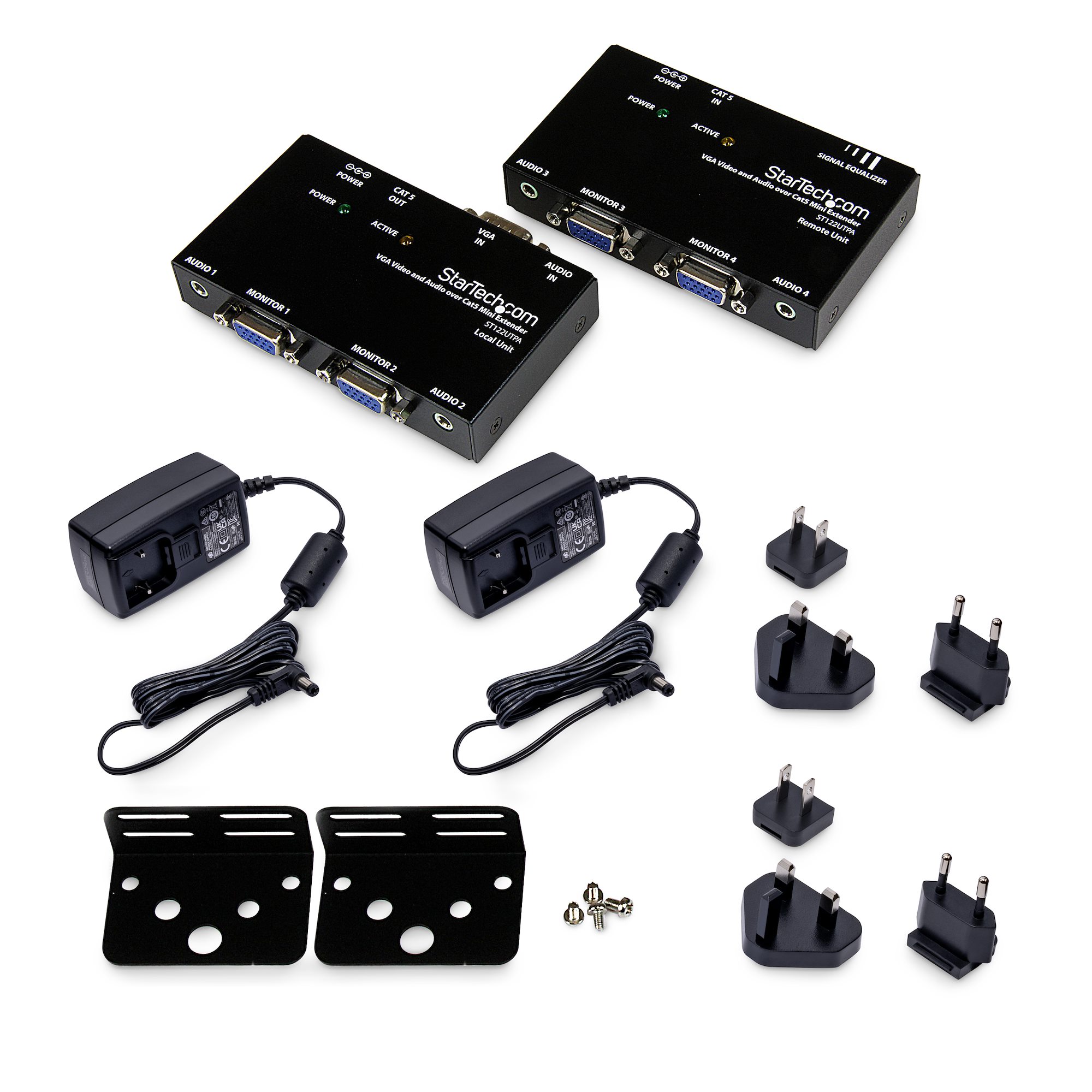 The VGA video and audio extender includes a local transmitter and a remote receiver, providing an out-of-the box solution that's perfect for point to point digital signage applications that require audio. To simplify installation, this kit also includes a mounting bracket for the ST122UTPA receiver to install onto walls, desks or cabinets for a tidy setup.