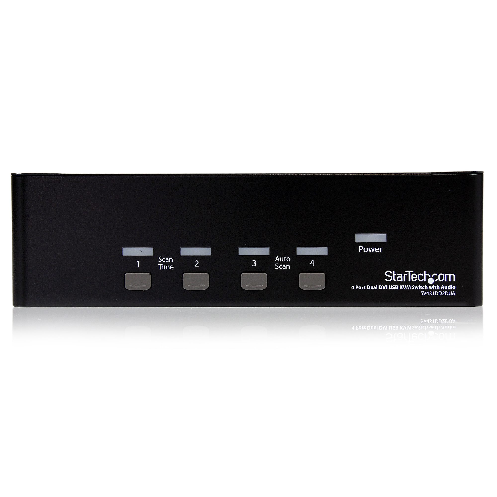The SV431DD2DUA 4-port Dual DVI USB KVM Switch allows up to four PCs, each with dual DVI video outputs, to share two monitors, one microphone and set of speakers, one keyboard and one mouse as well as two other USB peripherals.