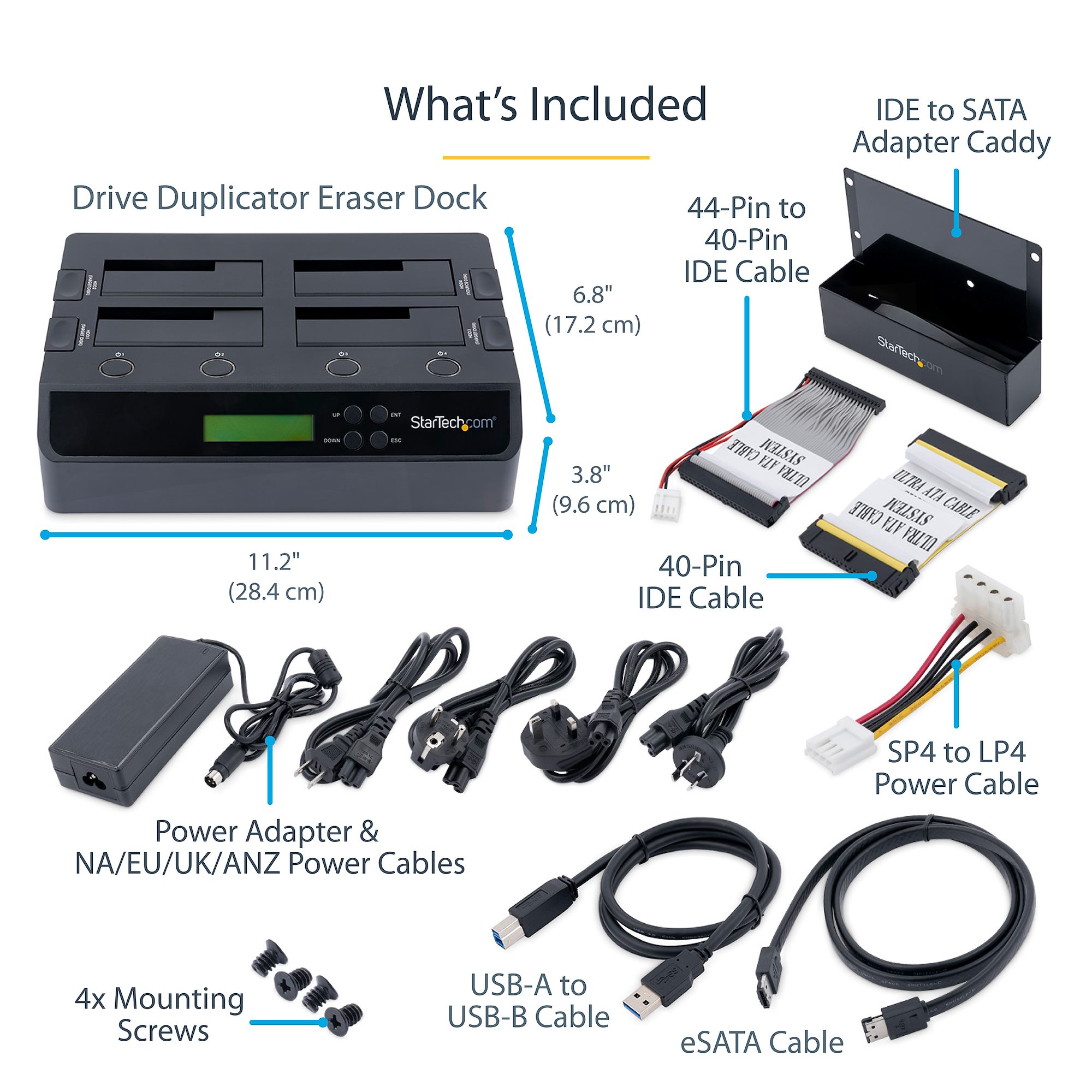 The SATDOCK4U3RE USB 3.0 and eSATA 1-to-3 Hard Drive Duplicator docking station enables you to duplicate/clone a single SATA hard drive to up to three other SATA drives simultaneously, as a standalone device. The duplicator can also function as a regular 4-bay hard drive docking station, by connecting to a host computer system. Large capacity drives (tested with up to 4TB 3.5" and 1TB 2.5" drives per bay) can be used to greatly enhance your computer's storage/backup capabilities.