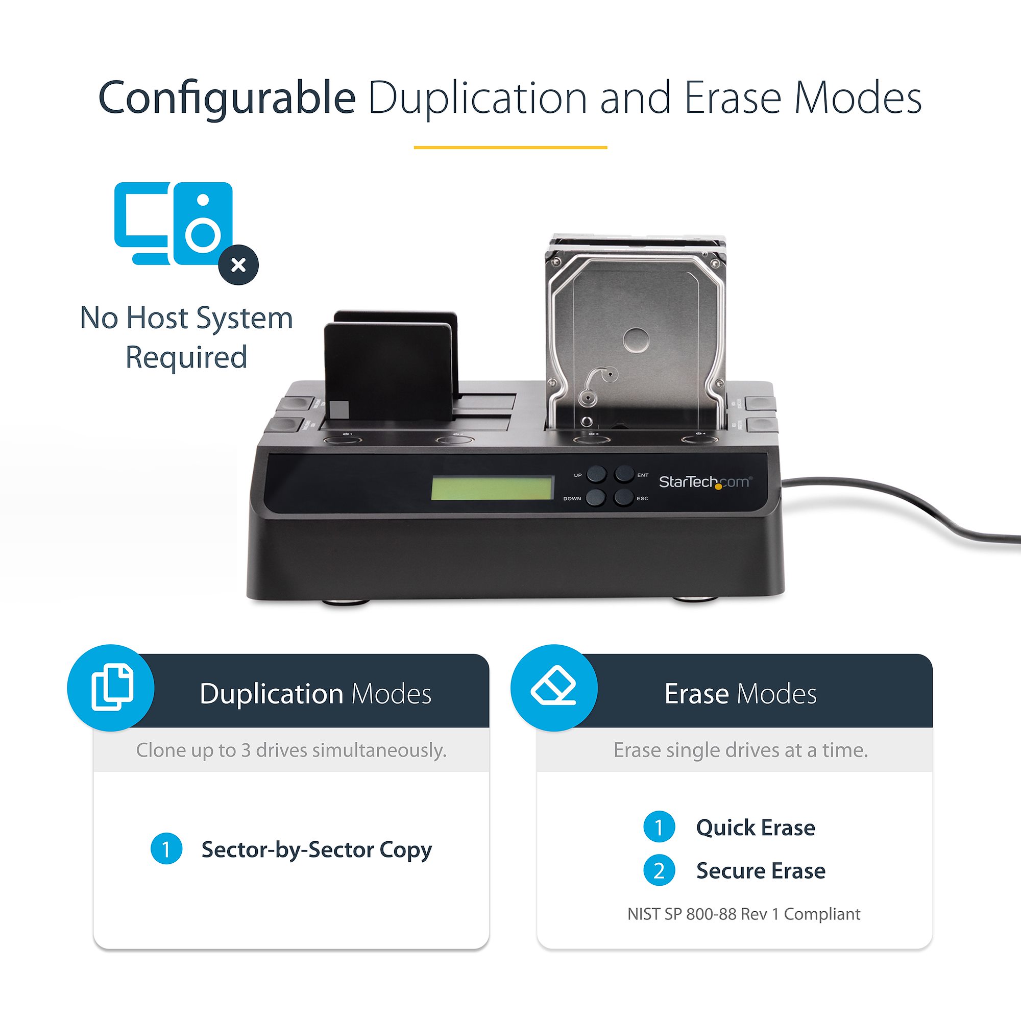 Able to perform 1:3 sector duplication, including HPA, from a single SATA drive onto three others simultaneously (at a rate of up to 72 MBps), the duplicator/docking station can save you time and effort. As an external HDD dock, it can be connected to your host computer through USB 3.0 or eSATA, providing data transfer speeds up to 5 Gbps or 3Gbps respectively, from the hard drives to your computer system.