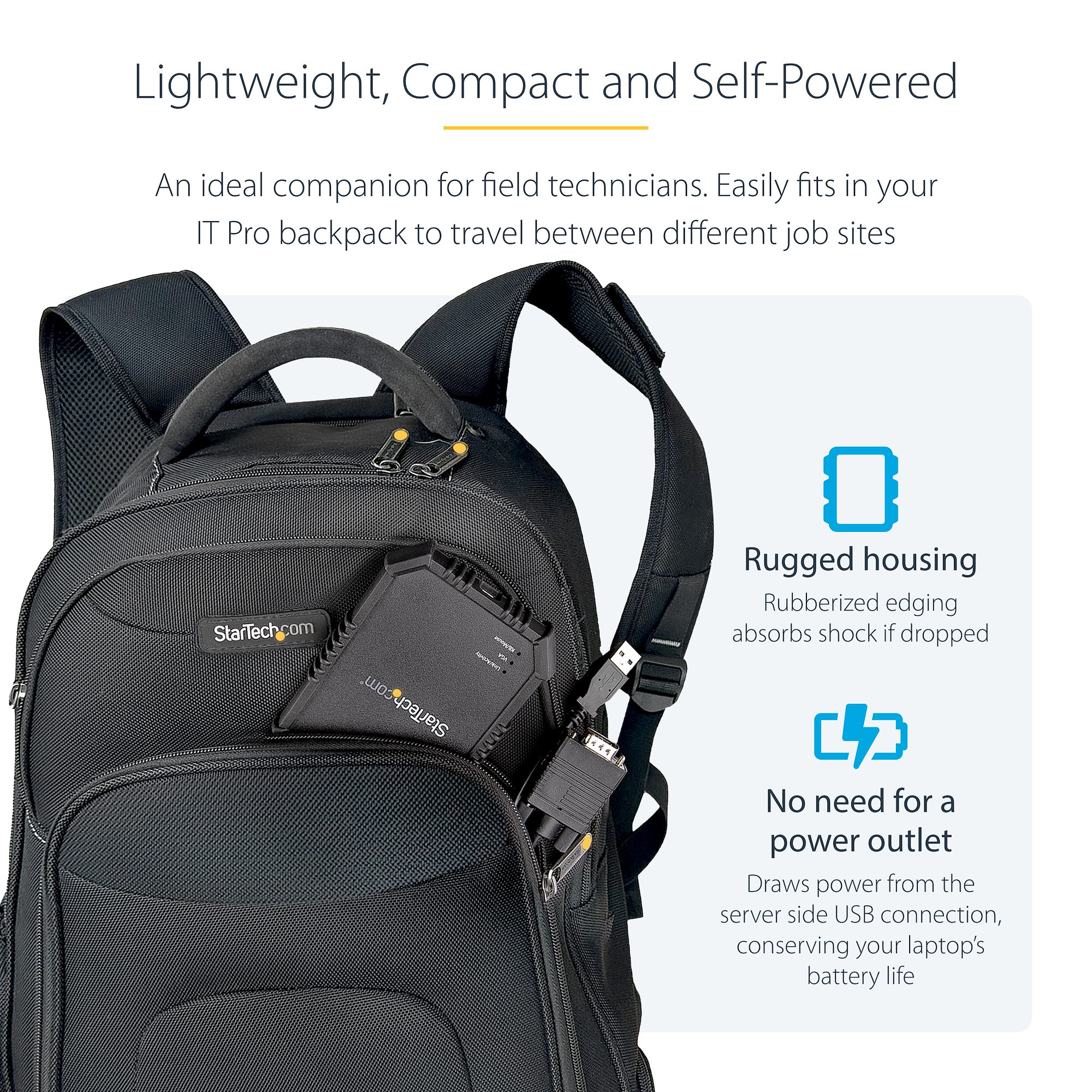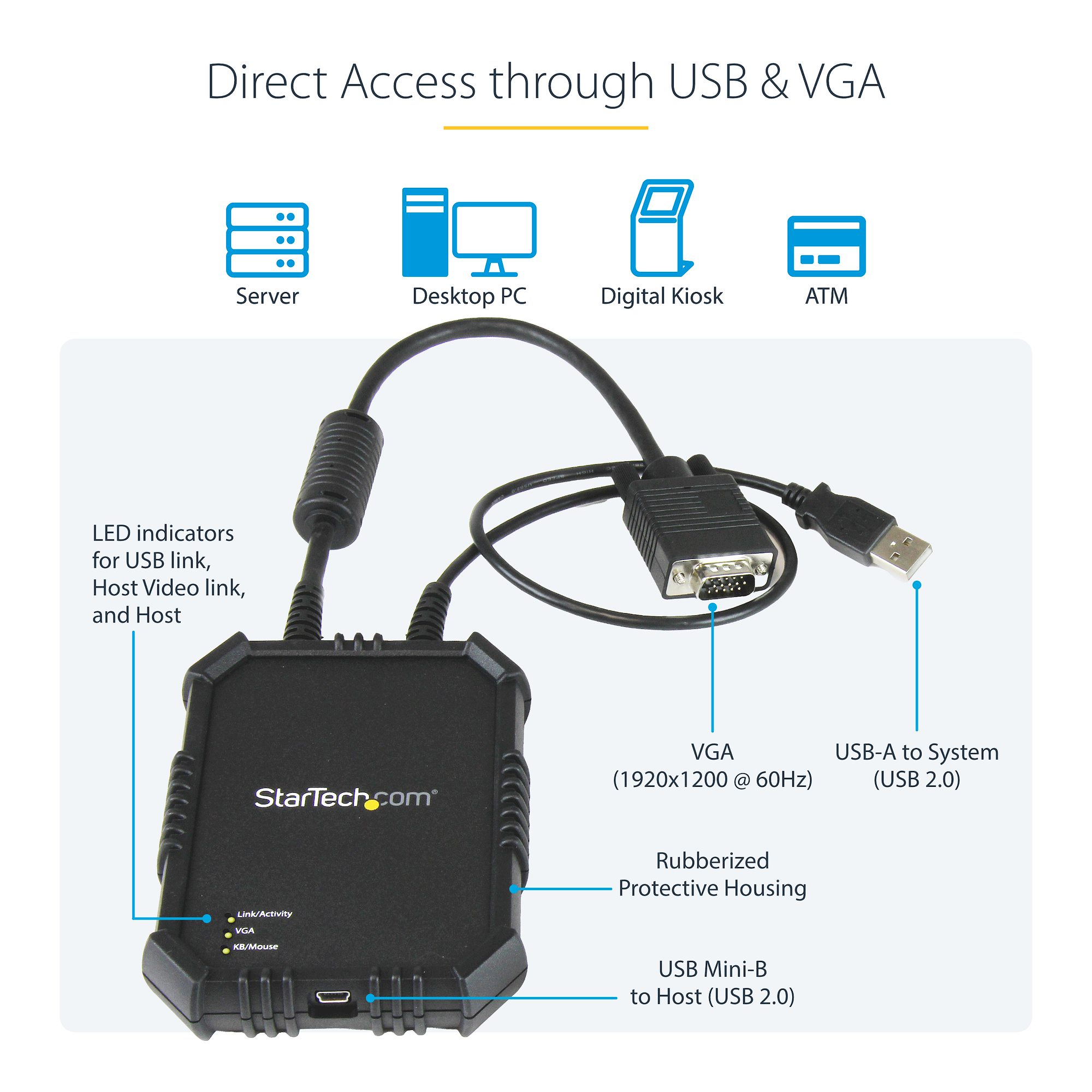 This rugged and portable USB crash cart adapter lets you turn your laptop into a portable console for accessing servers, desktops and laptops, as well as ATMs, kiosks or any computing device that features both VGA and USB ports.