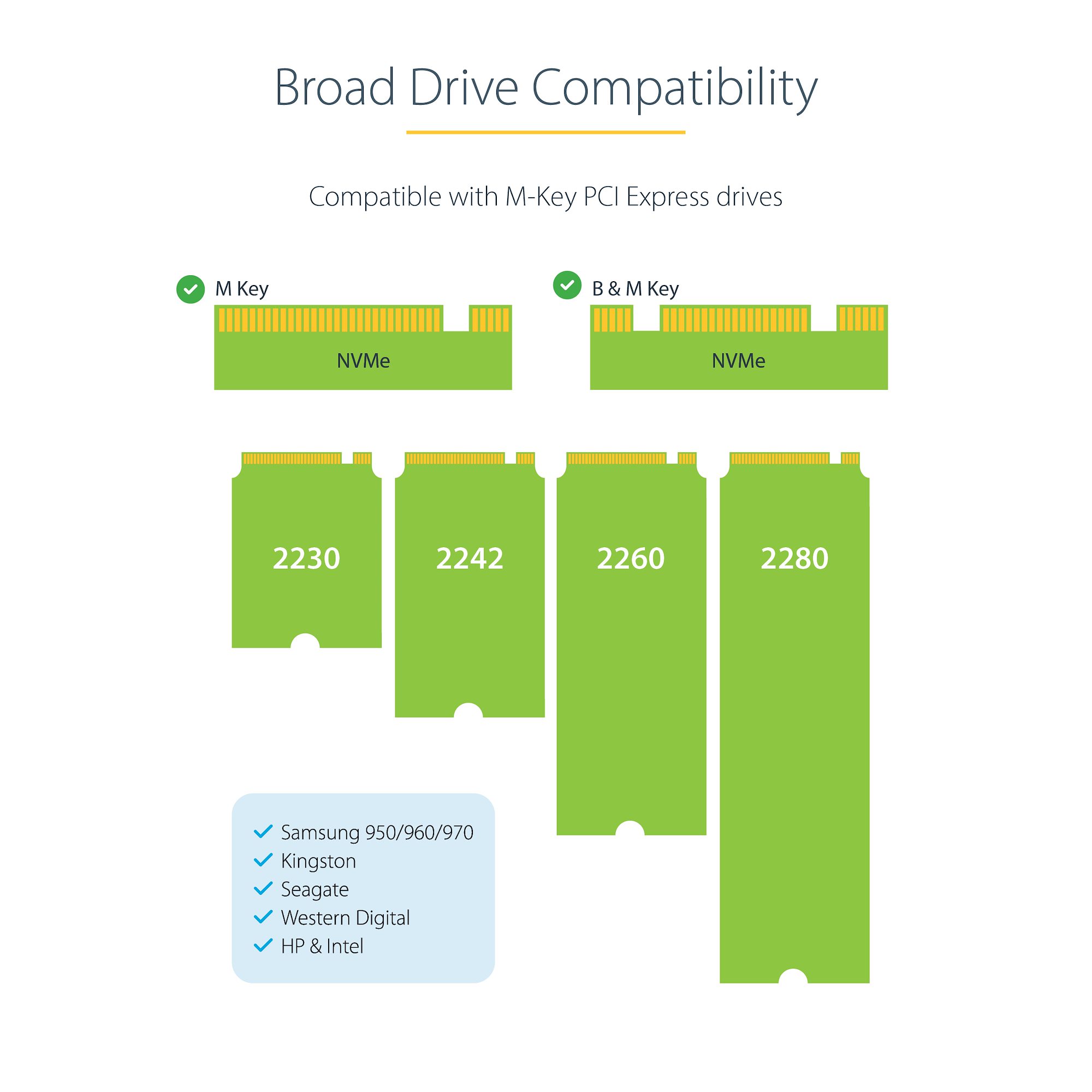 This slim, pocket-sized enclosure for PCIe based NVMe is specially designed for mobility, with a small form-factor design that fits easily into your laptop bag. Its lightweight, yet durable aluminum housing helps to ensure your drive won't be damaged while you're on the move.