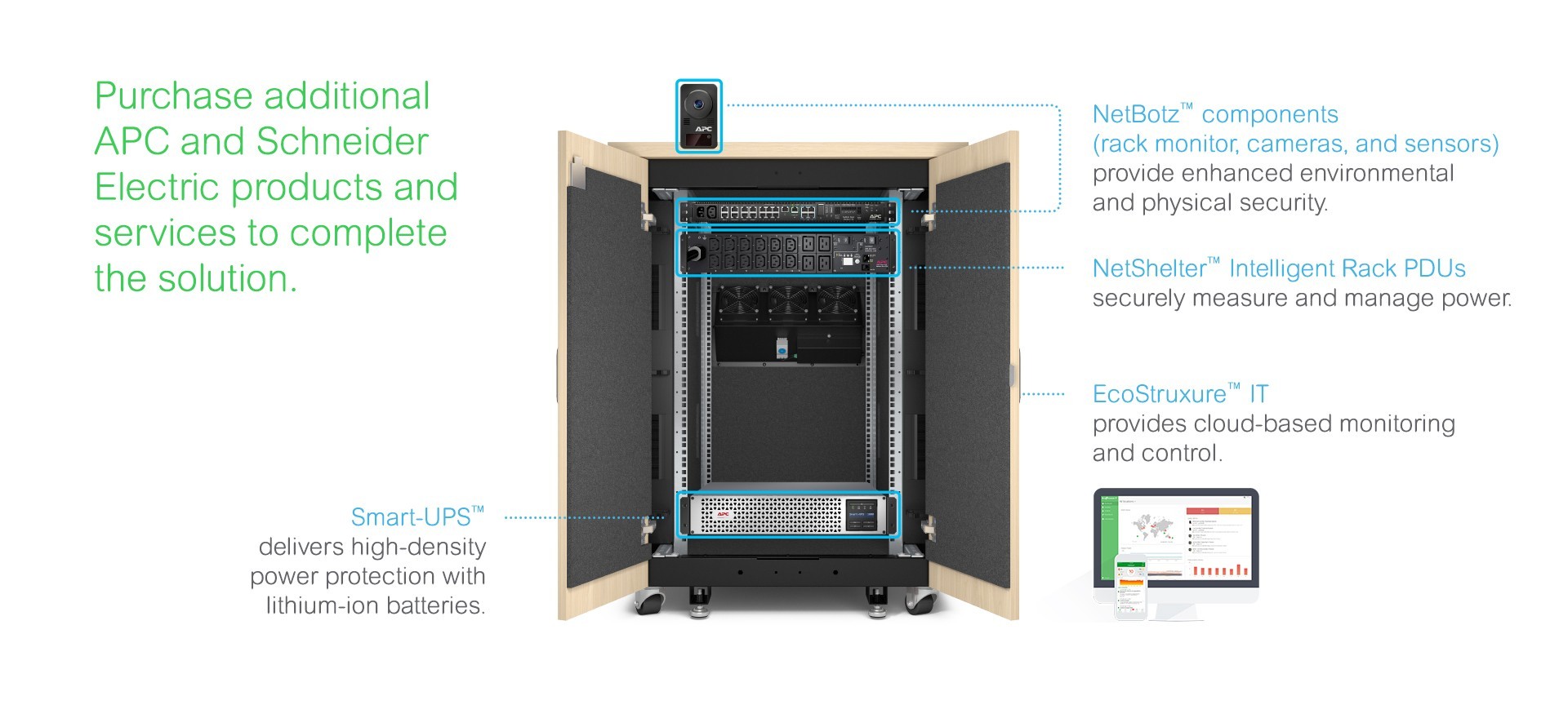 With the help of a sales representative, you can design your own EcoStruxure TM Micro Data Center using NetShelter Soundproof Rack. For example, you can add APC products and Schneider Electric services, such as APC Smart-UPS TM Ultra, NetBotz TM components for security and environmental monitoring (excluding the NetBotz handle), NetShelter intelligent rack PDUs, and EcoStruxure IT for remote monitoring and management of connected power devices. |
