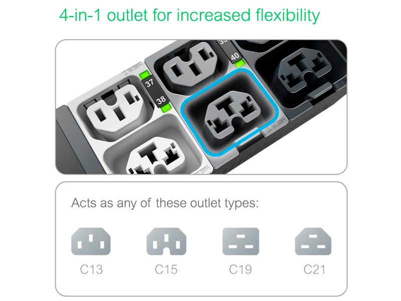 Innovative combination C13/C15/C19/C21 outlet for many rack layouts, configurations, & refreshes.