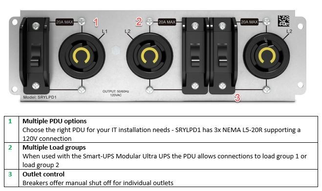 The APC Smart-UPS Modular Ultra has 3 blanking panels that can be replaced with user selectable PDU panels. The SRYLPD1 features 3x NEMA L5-20R 120V receptacles, each with breaker control.