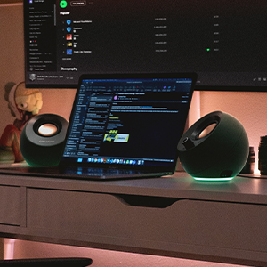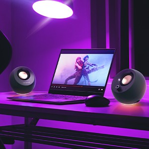 Now with customizable RGB lighting! The Creative Pebble Pro speakers let you pick from a selection of RGB LED colors and three lighting effects via a simple plug-and-play setup.