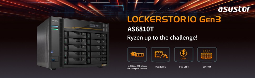 The Lockerstor Gen3 series is ASUSTOR’s fastest NAS ever! The combination of AMD’s Ryzen Embedded SoC, M.2 SSDs using PCIe 4.0, USB4, and dual 10GbE to ensure everything you want to do with your NAS is nothing short of extremely fast. With four M.2 slots for NVMe SSDs and up to ten bays for HDDs, the Lockerstor Gen3 series ensure that you get the best of both speed and capacity.