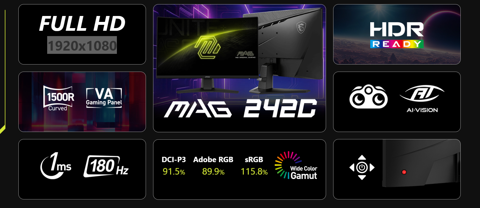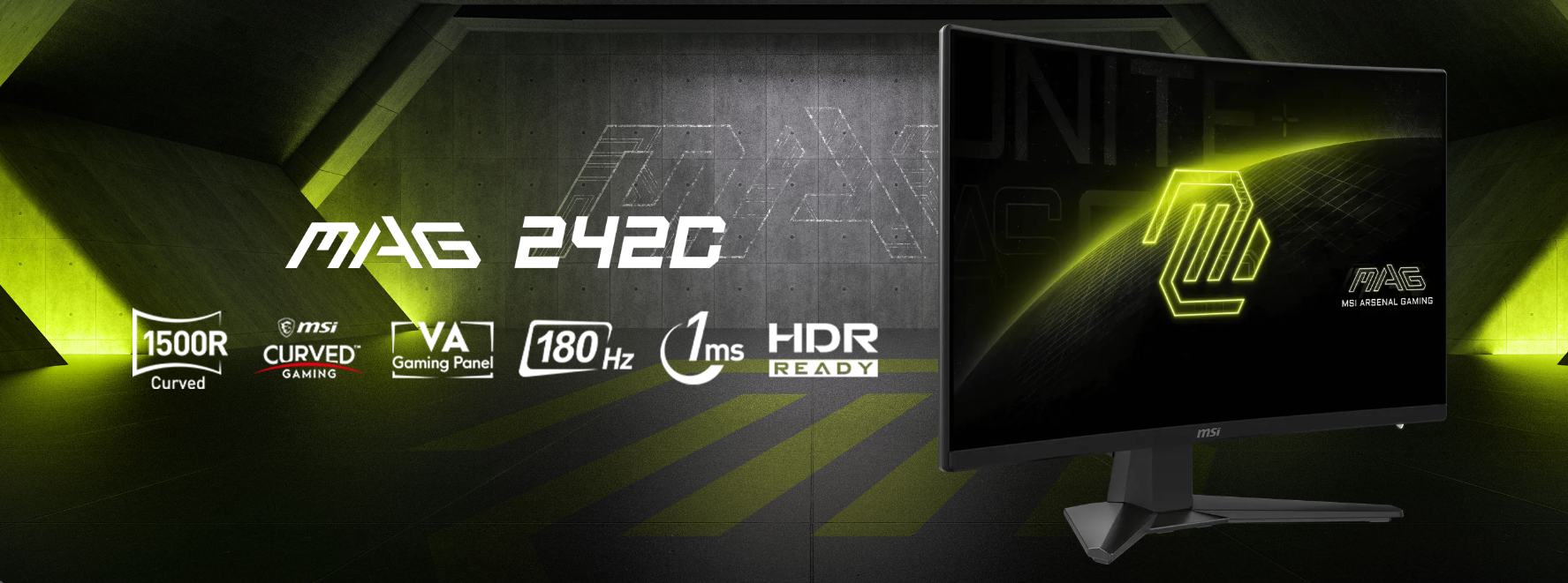 Experience immersive gaming with the MAG 242C gaming monitor. It features a 1920x1080 (FHD) panel, a 180Hz refresh rate, and a rapid 1ms (MPRT) response time. The monitor is HDR ready, enhancing eye-catching details through adjustments in contrast and shadows. Designed for competitive FPS, first-person RPG/MMORPG, and flight/racing simulator genres, the MSI MAG 242C Curved Gaming Monitor takes casual gaming to a new level, challenging players to see beyond the game.