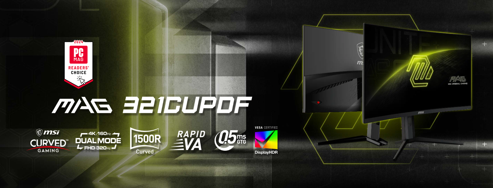 The MSI MAG 321CUPDF Gaming Monitor, 32 inches of stunning Rapid VA, Dual mode with UHD 160Hz and FHD 320Hz. Equipped with 0.5ms (GtG, Min.) response time, Frameless Design, VESA DisplayHDR 400, AI Vision. Perfect for competitive gamers seeking immersion. Upgrade your setup—check out now and game on