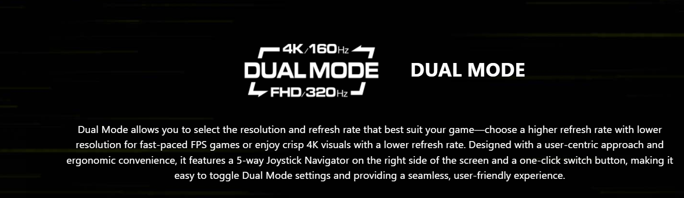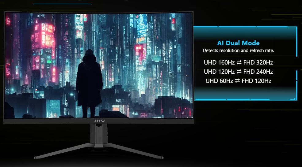 AI Dual Mode, exclusively developed by MSI, is an AI-powered feature that detects the current resolution and refresh rate, automatically adjusting to the optimal refresh rate when switching resolutions. No need to tweak Windows settings—players can enjoy seamless transitions with ease