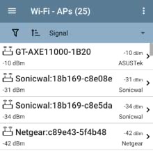 Quickly view all the APs present in the environment and see critical parameters for each one, including signal level, signal/noise ratio, security type, and channel. Find common issues, such as incorrect security type, poor signal coverage, or incorrect channel.