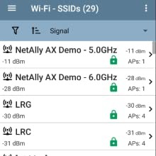 Quickly view all the networks present in the environment and see critical parameters for each one, including signal level, signal/noise ratio, security type, and number of access points. Find common issues such as mixed security types, poor signal coverage, or lack of secondary AP coverage.