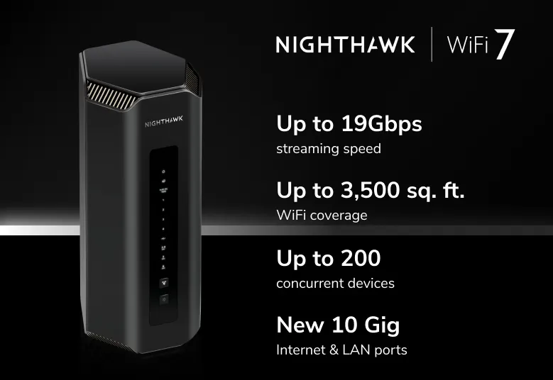 The most powerful & advanced Nighthawk router ever. Unrivaled WiFi 7 speeds up to 19Gbps for real-timing gaming, 4K/8K streaming, UHD video conferencing, and AR/VR entertainment