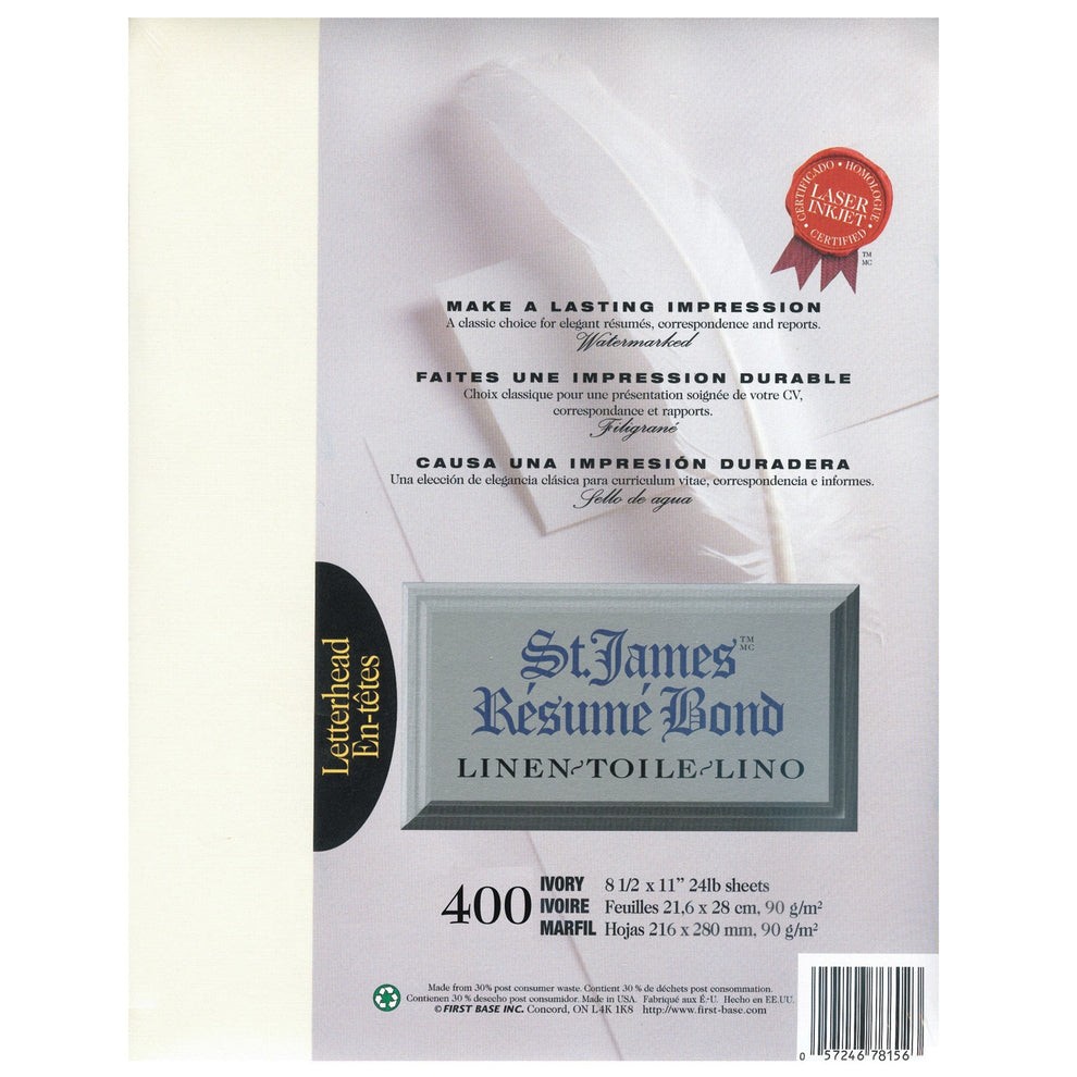 St. James® Résumé Bond, Linen, 24 lb Letter-Size Paper, Ivory, Pack of 400, 78156