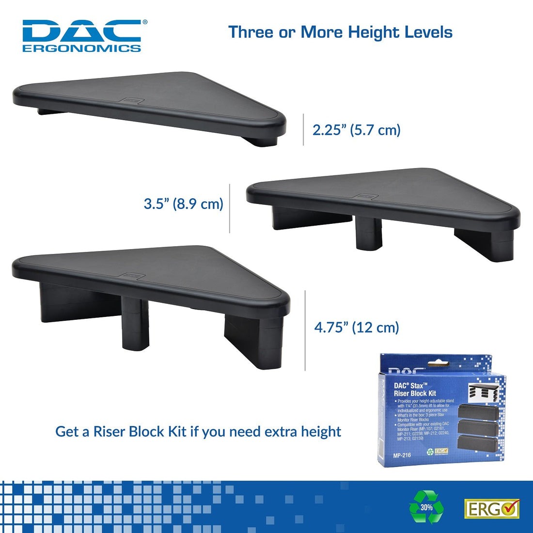 - Height adjustable from 1" (2.54 cm) to 4.8" (12.20 cm), 3 Heights included