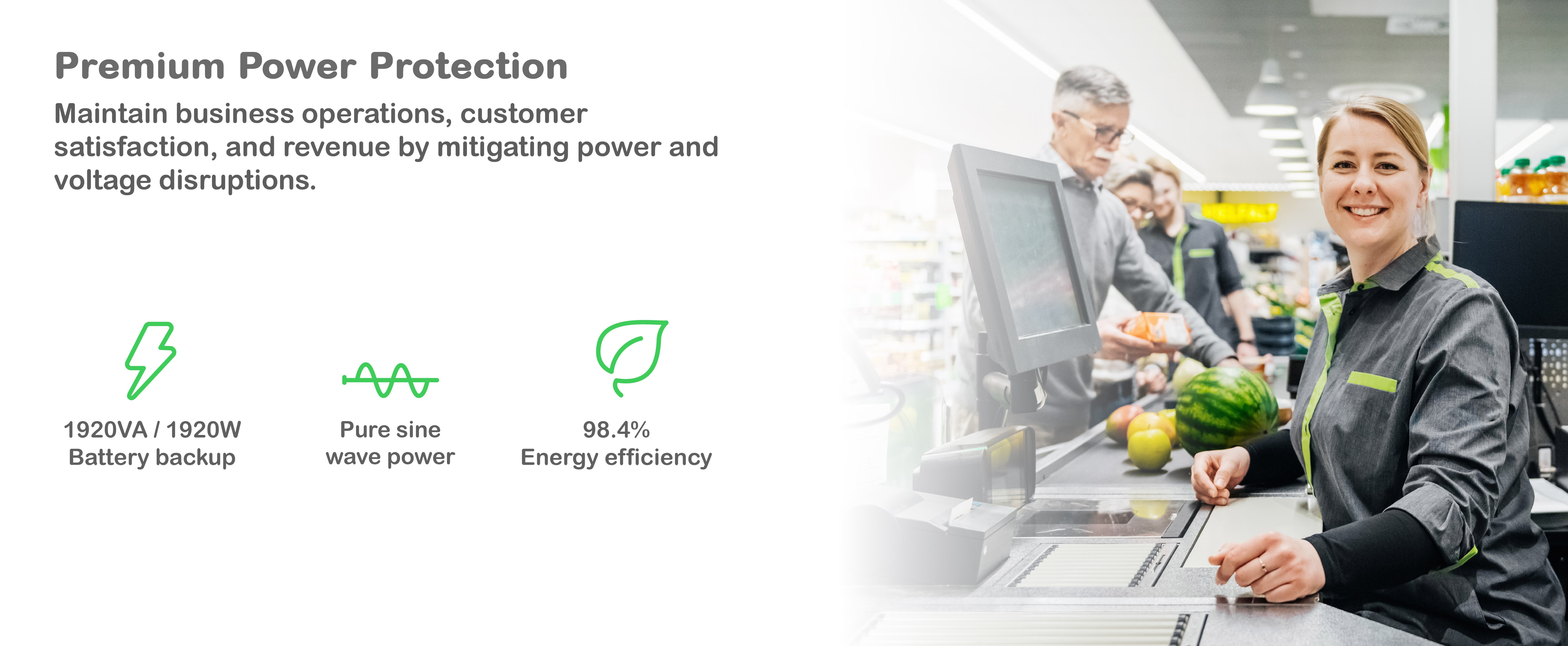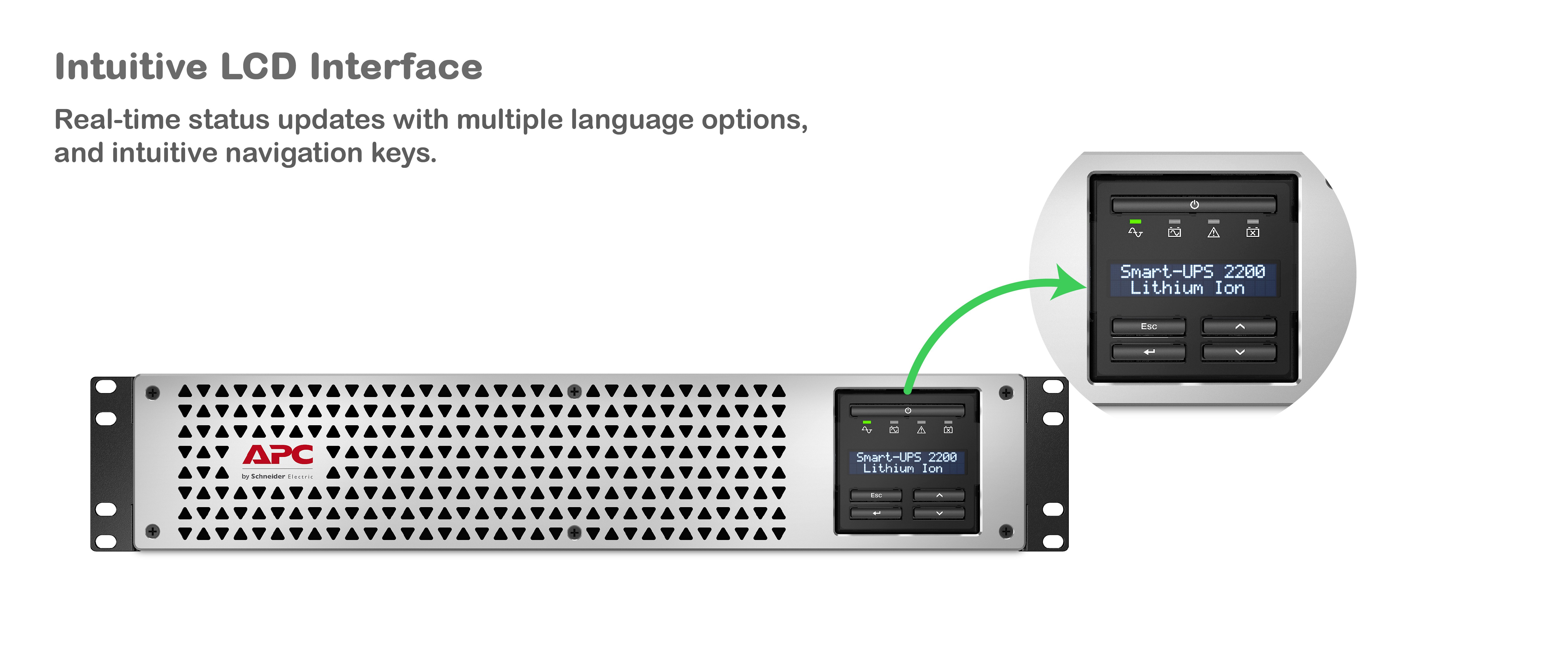 Graphical LCD display Quick, easy-to-read, intuitive LCD provides information about the utility and UPS conditions. |