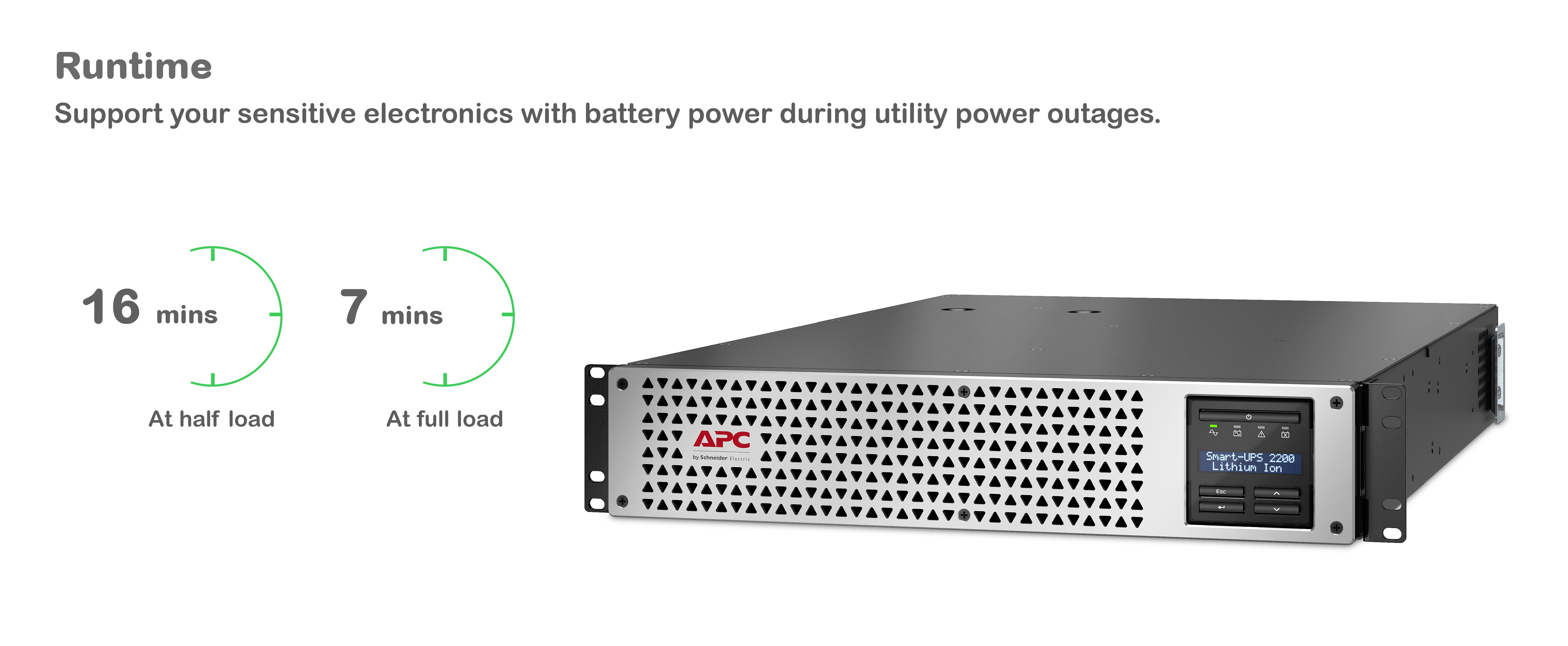 The Lithium-Ion batteries used in Smart-UPS can last 8 to 10 years or 3000 charge/discharge cycles. Valve Regulated Lead Acid (VRLA) batteries typically last 3 to 5 years or 200 discharge cycles.