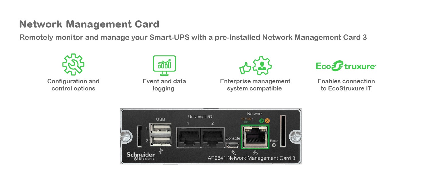 The Smart-UPS Lithium-ion have the AP9641 UPS network management card with environmental monitoring pre-installed.