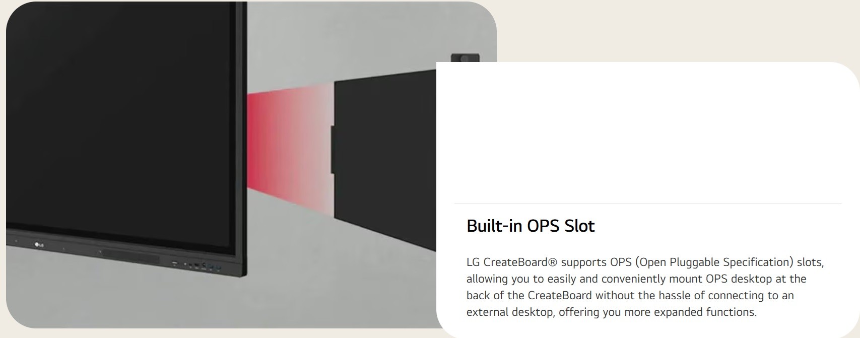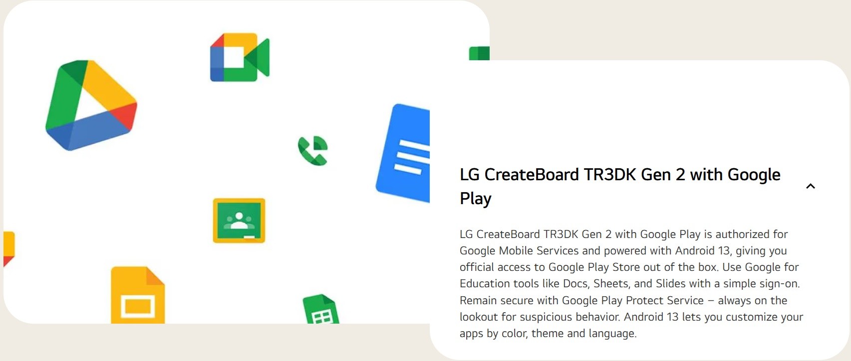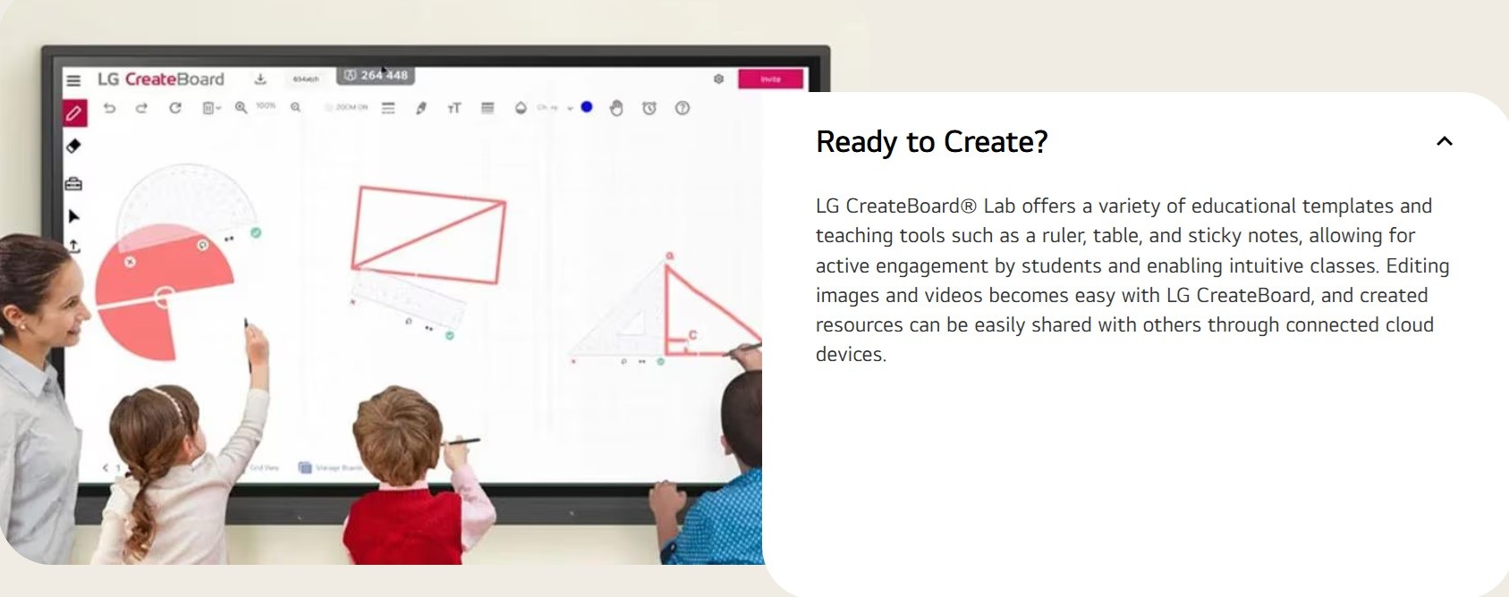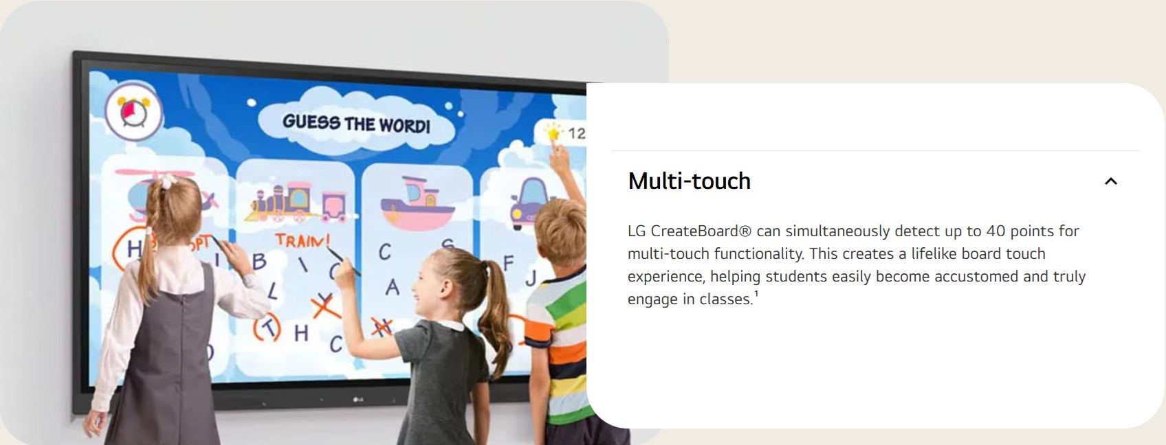 LG CreateBoard supports wireless Bluetooth connections to various devices such as a speaker, mouse, or keyboard, and files can be easily shared from any devices connected to the LG CreateBoard® Share app.² Plus, the CreateBoard's built-in forward facing speakers provide exceptional sound throughout a classroom.