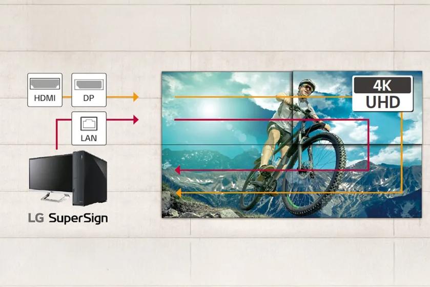 A LAN daisy chain allows you to control and monitor video walls and even update their firmwares at once. Also, through UHD daisy chain using HDMI and DisplayPort, you can easily set up a UHD video wall without the need of DisplayPort MST.