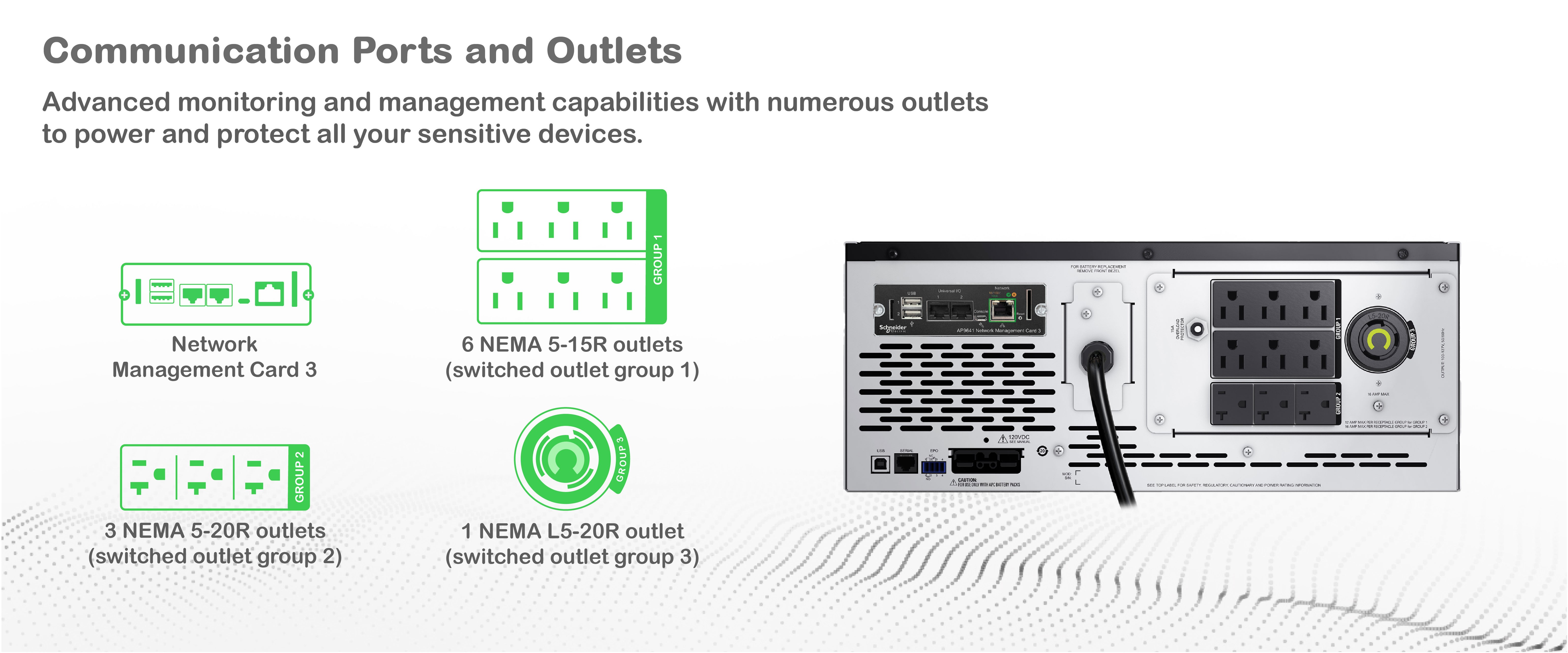 Options for monitoring and managing your UPS include EcoStruxure IT, Network Management Card and PowerChute.