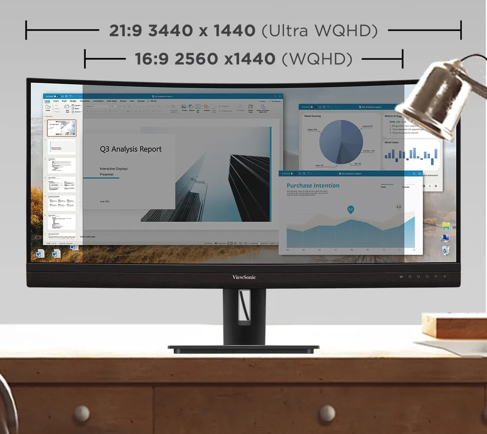 Ultrawide Quad HD 3440 x 1440 resolution delivers incredibly sharp picture quality, while a 21:9 aspect ratio provides more screen real estate.