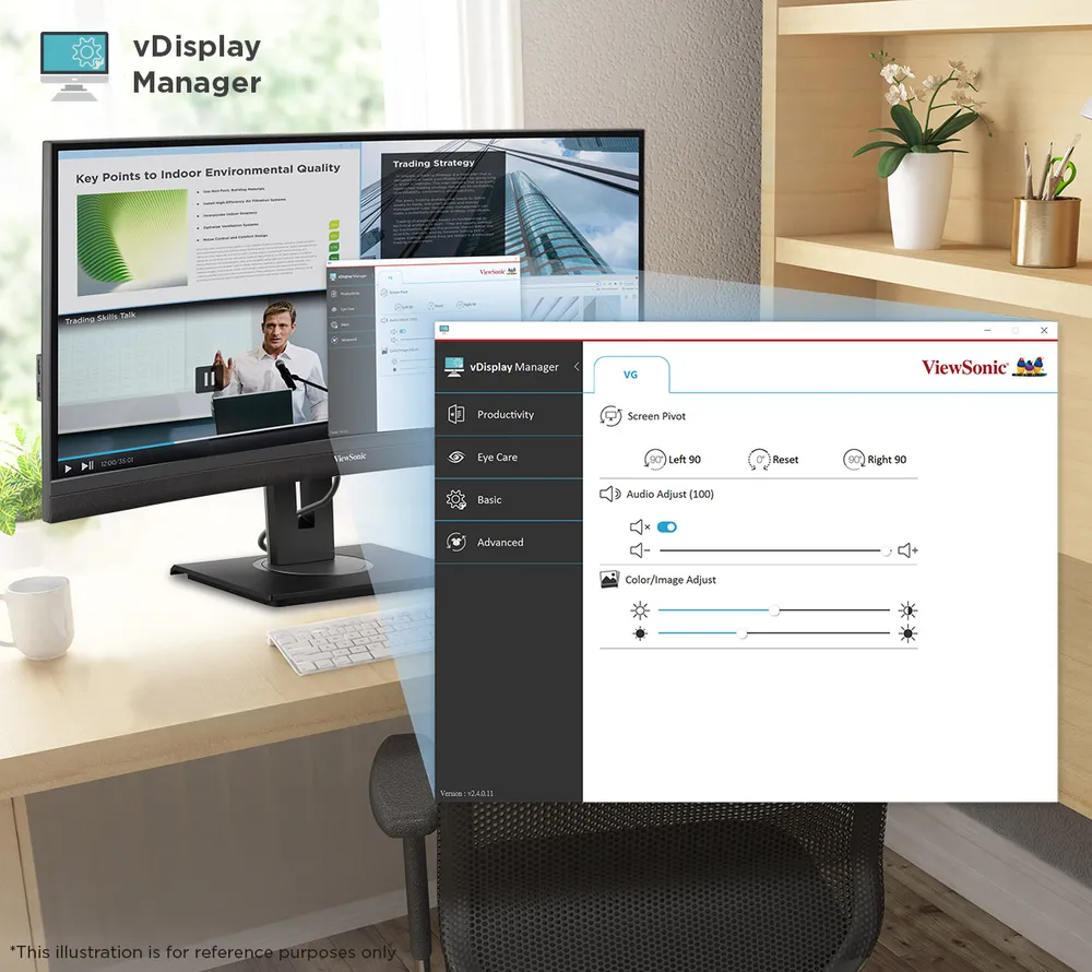 vDisplayManager software boosts productivity by placing the On-Screen Display (OSD) controls directly on your screen. It also includes split-screen functionality, letting you customize window layouts and sizes with ease.