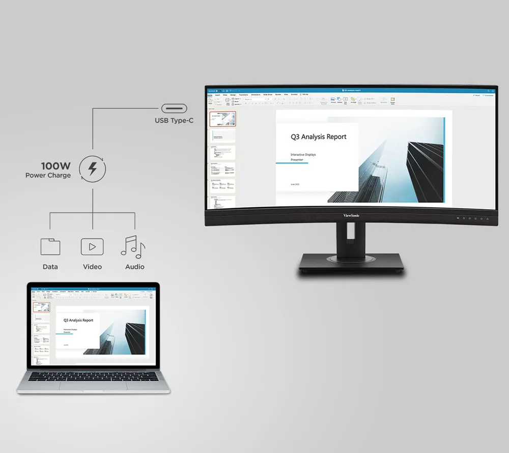VG3456CA USB-C docking monitor. Save hundreds with a built-in docking station that includes USB-C connectivity with 100W power delivery, an RJ45 Ethernet port, and an integrated USB hub that makes it easy to connect the latest laptops and systems. This 34" curved ultrawide monitor offers expansive screen space with a UWQHD 3440x1440 resolution. Its 21:9 aspect ratio provides additional workspace, allowing you to display more content simultaneously - without the bezel gap that can be typically found in dual-monitor setups. The immersive 1500R curvature enhances viewing comfort and reduces eye strain by mimicking the natural curvature of the human eye. Elevate your productivity and unlock more screen space with the VG3456CA USB-C monitor today.