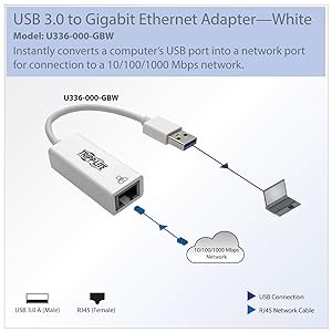 With the U336-000-GBW, connecting your computer to a Gigabit network couldn’t be simpler. Weighing less than an ounce, it’s small and lightweight enough to take with you wherever you go. And there’s no need to install an internal Ethernet card in your computer. Just plug it into a USB port and connect to a network using Cat5e/6 cable. One end has a USB 3.0 A male connector and the other has an RJ45 female connector. Two LEDs let you know when you’re connected to a network and when data is being transferred.