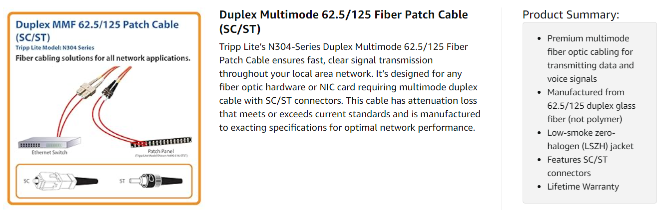 The N304-Series is manufactured using top-quality materials. It has 62.5/125 duplex (zipcord) fiber made from glass instead of a polymer, a low-smoke zero-halogen (LSZH) jacket, sturdy SC/ST connectors and is FDDI and OFNR rated. The LSZH jacket limits the amount of toxic smoke emitted in case of combustion and is perfect for poorly ventilated areas. The jacket is orange to distinguish the N304-Series from singlemode cables.