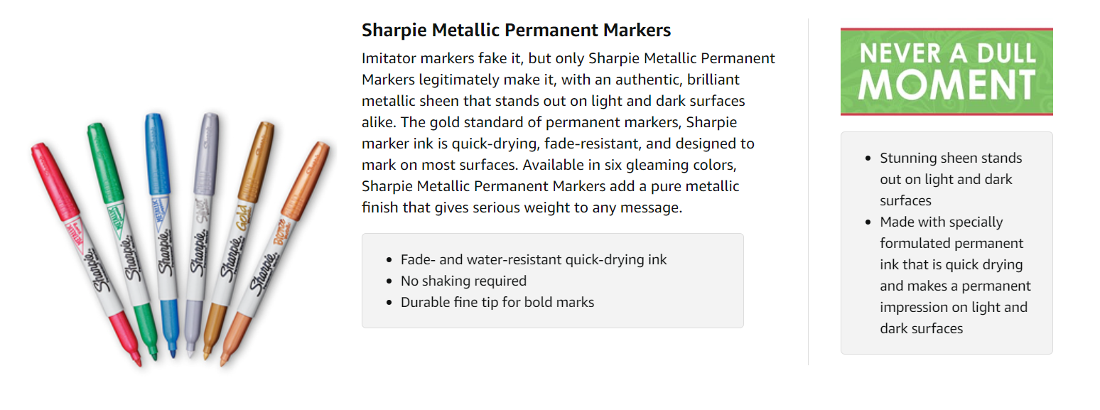 Fade-ResistantSharpie Metallic markers deliver quick-drying, pure metallic marks that resist fading and water. What's more, you don't need to shake before you mark. |