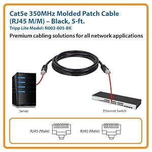 For peace of mind, this five-foot Tripp Lite Cat5e 350MHz Molded Patch Cable comes backed by a lifetime warranty. The N002-005-BK is manufactured in compliance with strict RoHS specifications, reflecting Tripp Lite’s commitment to environmental responsibility.