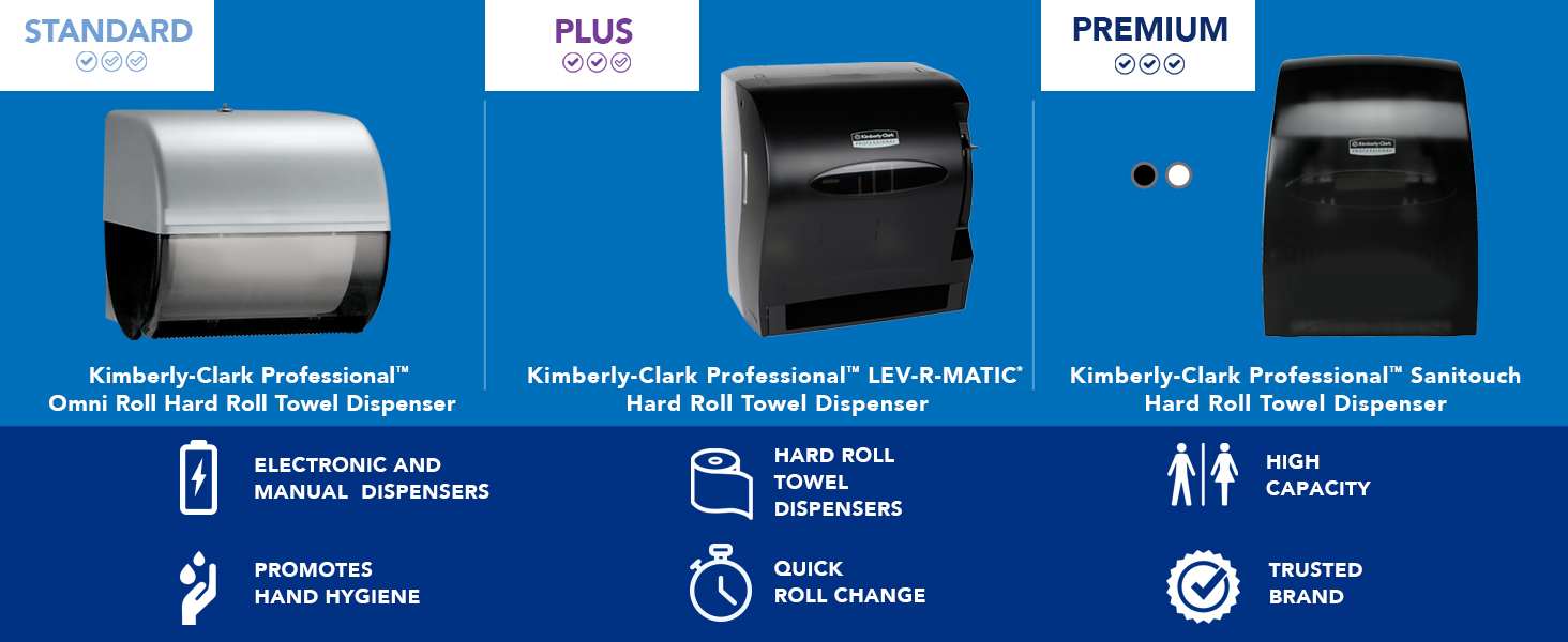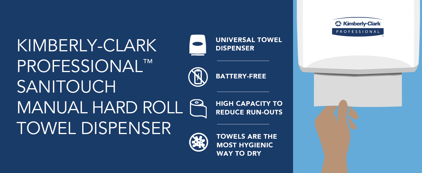 Style:Towel Dispenser Reduce maintenance time and run-outs with a high-capacity washroom towel system. The Sanitouch Hard Roll Paper Towel Dispenser is a reliable and efficient hand-drying system that's perfect for your workplace. Whether you have a retail location, office or high-traffic location, your washroom guests will only touch the towel they use, thanks to the touch free, one-at-a-time dispensing system. This wall mount dispenser is made of durable plastic and comes in an attractive shade of black, called Smoke, so it will go with any washroom décor. Compatible with Kleenex and Scott Brand Hard Roll towels with a 1.5" core, by providing high-quality towels in your washroom, you'll increase your maintenance efficiency.