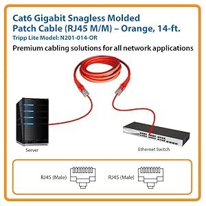 For peace of mind, this 14 feet Tripp Lite Cat6 Gigabit Snagless Molded Patch Cable comes backed by a lifetime warranty. The N201-014-OR is manufactured in compliance with strict RoHS specifications, reflecting Tripp Lite’s commitment to environmental responsibility.