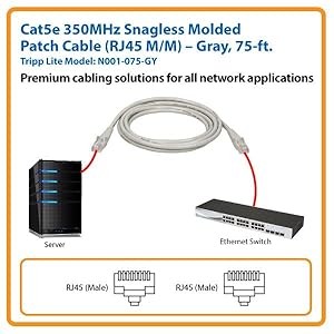This 75-ft. Tripp Lite Cat5e 350MHz Snagless Molded Patch Cable is the ideal solution for connecting network components like computers, printers, Internet-enabled gaming systems and Blu-ray players, copy machines, routers and modems in a home or office application.