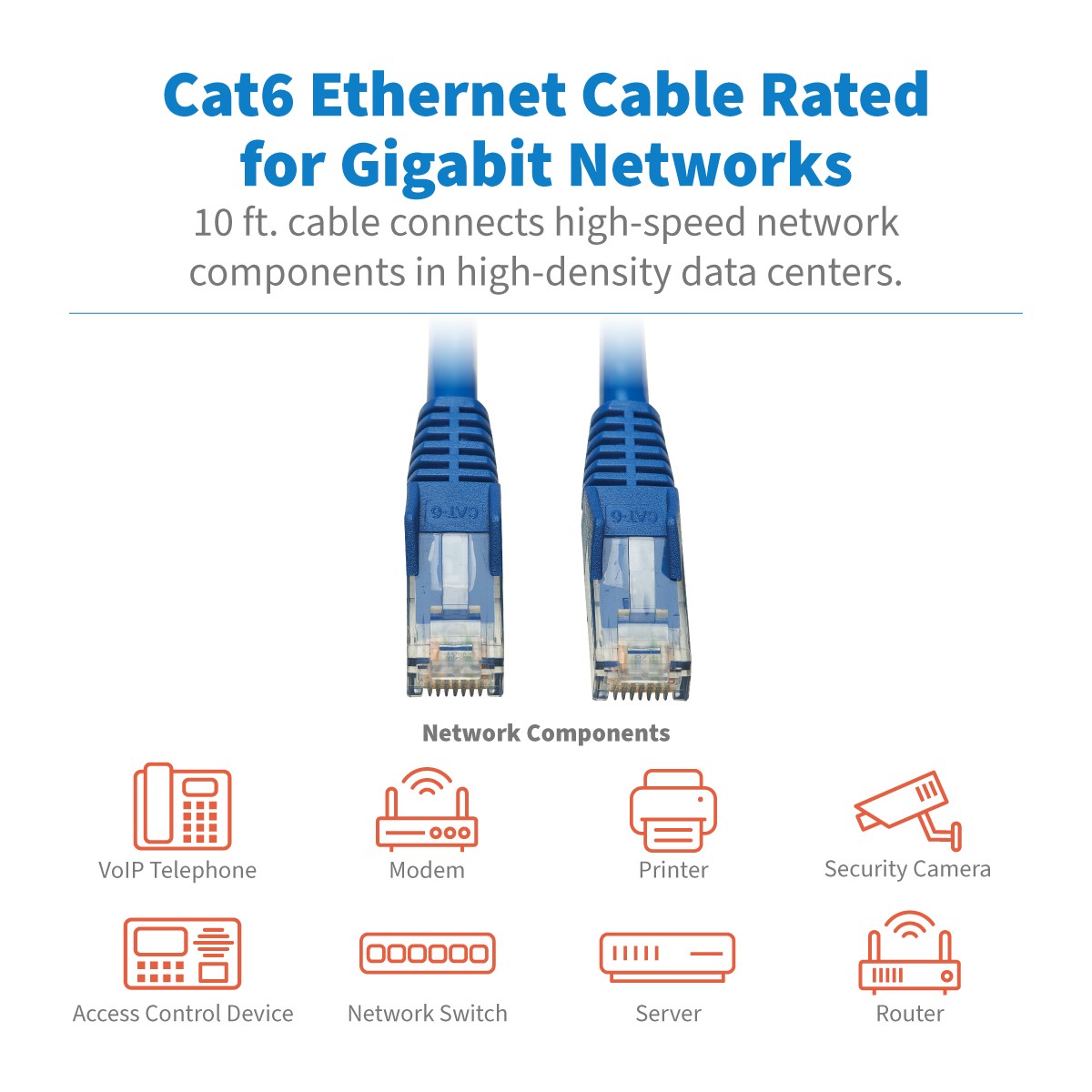 This Tripp Lite Cat6 UTP cable with RJ45 connectors is recommended for connecting network components like printers, adapters, routers, servers, modems, hubs and switches in high-density data centers.