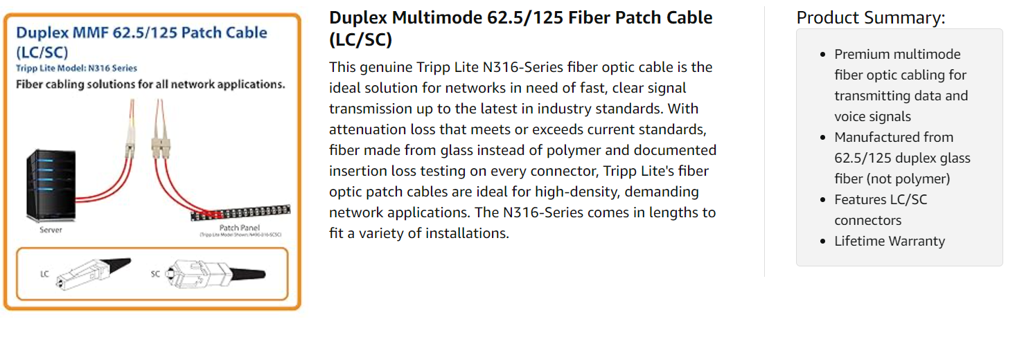The N316-Series is manufactured using top quality materials. With 62.5/125 duplex fiber, a FDDI and OFNR-rated PVC jacket, sturdy connectors and fiber made from glass instead of a polymer, Tripp Lite's fiber optic cables are made to last in high-demand data center and networking applications.