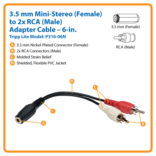 The P316-06N 6-in. Adapter Cable allows mobile devices with a 3.5 mm stereo output to be connected to home audio RCA inputs. Unlike cut-price audio cords, the P316-06N is manufactured to exacting specifications, using superior materials, for reliable performance and long life. For peace of mind, the P316-06N comes with a lifetime product warranty and is RoHS-compliant.