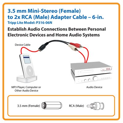 While most mobile devices use the 3.5 mm stereo headphone output, most home audio systems with an amplifier or receiver use dual RCA jacks that distribute two discreet channels of audio over the left and right speakers. Featuring a 3.5 mm female connector on one end and a set of RCA stereo connectors on the other end, the P316-06N is ideal for adapting the output of your MP3 player or smartphone to your home audio system. Simply insert the P316-06N’s red and white connectors into your home audio system’s color corresponding jacks and plug your personal device’s mini-stereo male plug into the female connector for high-fidelity audio.