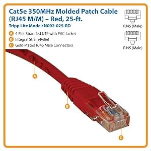 Manufactured from 4-pair stranded UTP, the N002-025-RD provides high-speed connection and flawless signal delivery. This cable can deliver speeds up to 350MHz/1 Gbps. Featuring a PVC jacket, this 25-ft. Tripp Lite Cat5e 350MHz Molded Patch Cable is constructed of top-quality materials for long life and durability. Its RJ45 (male) connectors are gold-plated for accurate signal transfer, and its molded integral strain-reliefs provide a secure connection. The N002-025-RD meets the most current industry standards, including IEEE 802.3ab, IEEE 802.5, ANSI/EIA/TIA 568, ISO/IEC 11801 and ETL (category 5e draft 11).