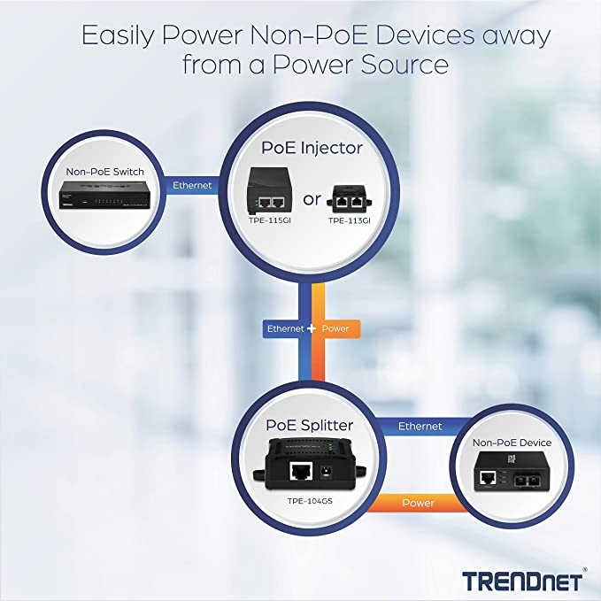 PoE PoweredNo power adapter necessary; the TPE-104GS takes a PoE network connection and splits power and data into separate connections to network a non-PoE device with power up to 100m (328 ft.) |