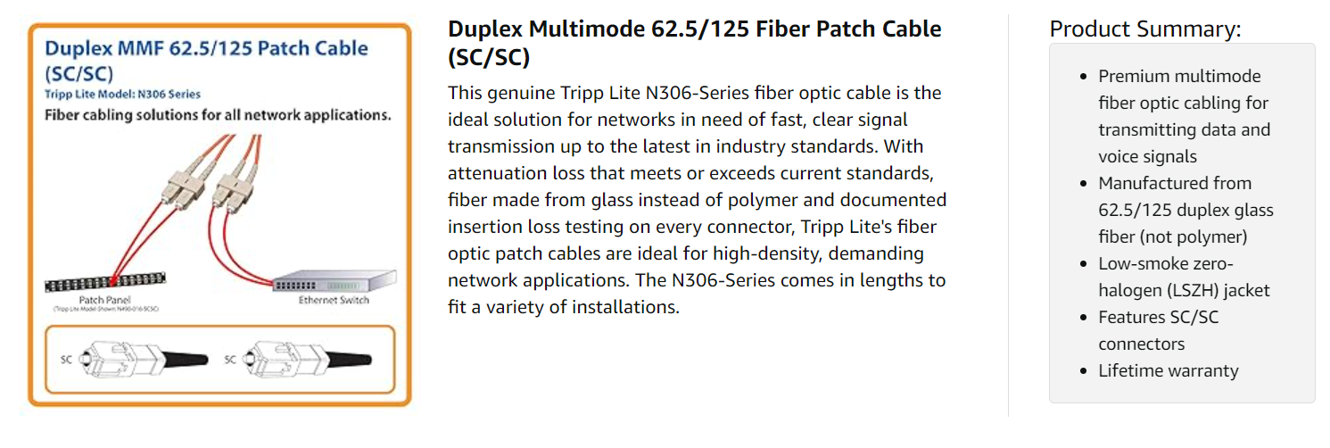 The N306-Series is manufactured using top-quality materials. It has 62.5/125 duplex (zipcord) fiber made from glass instead of a polymer, a low-smoke zero-halogen jacket (LSZH) and sturdy SC connectors. The LSZH jacket limits the amount of toxic smoke emitted in case of combustion and is perfect for poorly ventilated areas. The jacket is orange to distinguish the N306-Series from singlemode cables.