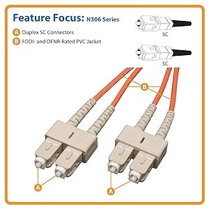 The N306-Series has dual SC/SC connectors that are widely compatible and thoroughly tested to meet stringent insertion loss standards. The connectors have beveled edges for a secure connection.