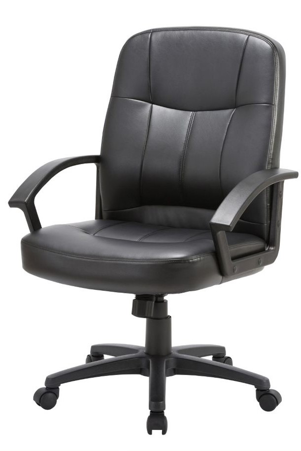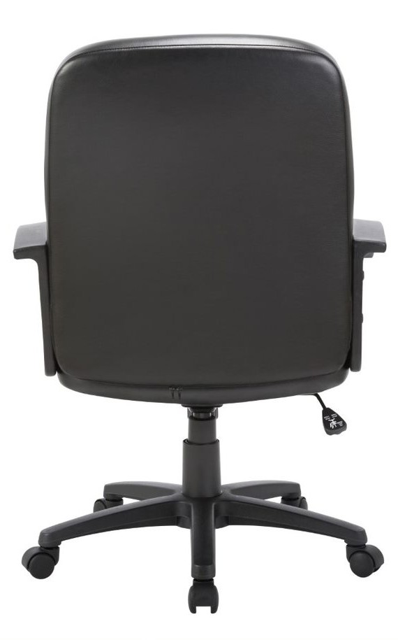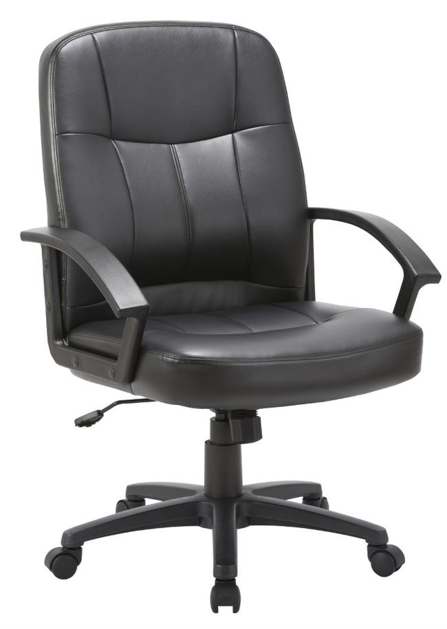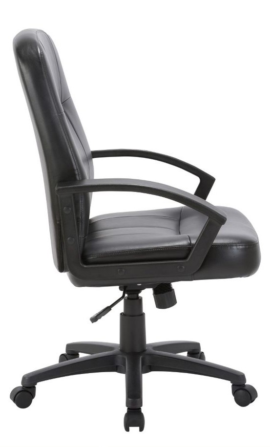Managerial mid-back chair offers a fully upholstered design with black, split leather for a rich classic look. Black frame has stylish open loop arms and five-star nylon base with casters for mobility. Functions include pneumatic seat-height adjustment, 360-degree swivel, tilt and tilt tension. Seat cushion is 21-1/2" wide x 19-1/2" deep. Seat back measures 21" wide x 25-1/2" high. Mid-back chair meets the CA117 fire-retardant standard.