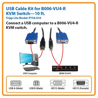 Quickly and easily connect a USB computer to a Tripp Lite B006-VU4-R KVM Switch. Tripp Lite’s P758-010 USB Cable Kit consists of a 10-ft. cable with connectors on each end. The KVM switch end has a USB B (male) connector and a SVGA (HD15) female connector. The computer end has a USB A (male) connector and a SVGA (HD15) male connector. For peace of mind, the P758-010 comes backed by a lifetime product warranty and has an eco-friendly, RoHS-compliant design.