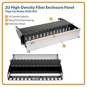 Made of heavy-duty steel, the N482-02U accommodates up to 14 Tripp Lite N482-Series high-density fiber cassettes. This allows you to patch up to 168 Duplex LC ports (336 fiber connections). The N482-02U offers the ability to manage cables from any direction, both in the front and back of the enclosure. A protective panel prevents cables from being struck or accidentally disconnected. Fold down the panel to reveal a space to label your connections, so you’ll know exactly which cable connects to which device. The built-in, easy-access wire manager keeps cables organized. The protective panel and wire manager are removable, allowing for many different configurations.